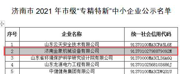 根據(jù)《山東省“專精特新”中小企業(yè)認(rèn)定管理辦法》(魯工信發(fā)〔2020〕7號)、《關(guān)于組織推薦第三批專精特新“小巨人”企業(yè)和開展2021年度山東省“專精特新” 中小企業(yè)培育認(rèn)定工作的通知》等文件精神,省工業(yè)和信息化廳組織開展了2021年度省“專精特新”中小企業(yè)培育認(rèn)定工作。經(jīng)嚴(yán)格審查,濟(jì)南金象機(jī)械設(shè)備有限公司順利通過2021年度省市兩級“專精特新”企業(yè)評審,成為2021年度山東省和濟(jì)南市“專精特新”企業(yè)。