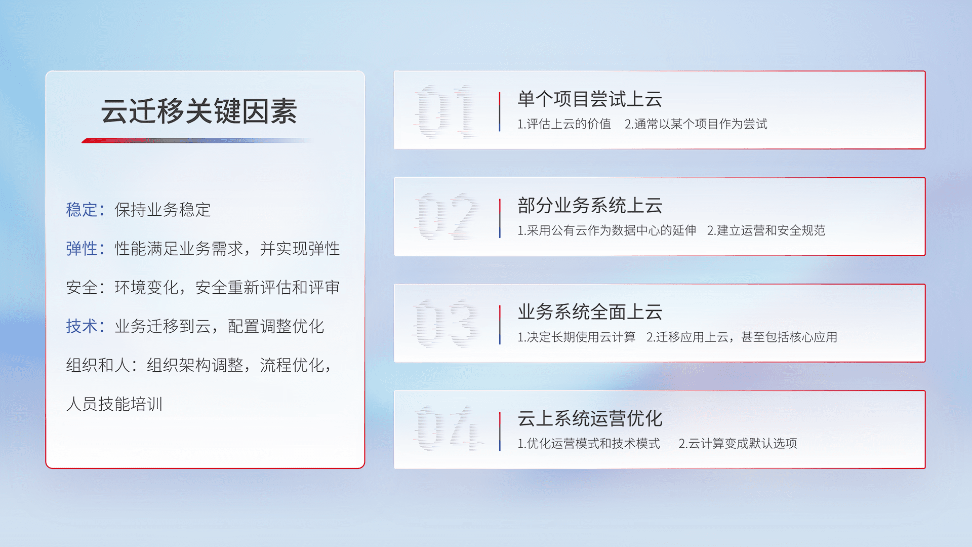 结合实际业务,,,,从规划设计、、、云平台选型、、、云原生改造、、、、数据迁移、、、、集成交付,,迁移全过程为客户识别最佳上云路径,,,做好风险识别管理,,设计网络架构、、、身份权限、、安全审计合规、、、、操作审计、、日志审计、、、、监控告警策略、、、、多站点容灾设计等,,,,对云上基础设施进行整体规划,,,,提升IT治理水平,,以满足弹性、、高可用、、、、高性能的需求。。。